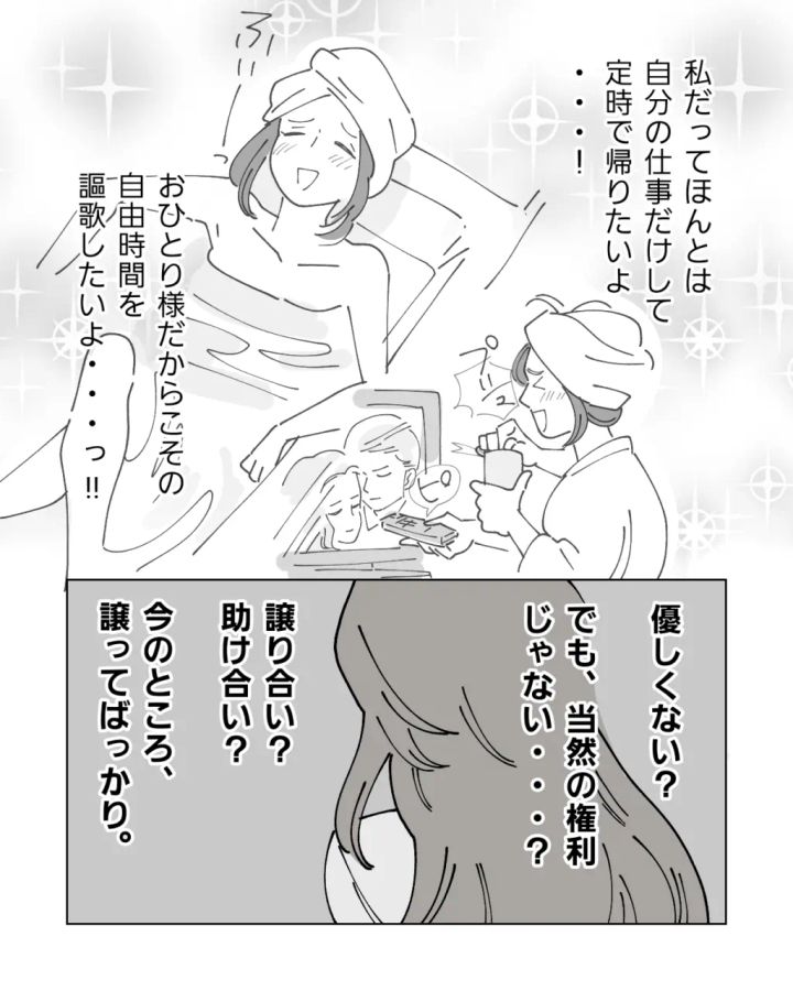 私だって本当は、自分の仕事だけを終えて定時で帰りたいし、おひとり様だからこその自由時間を思いきり楽しみたい。子育て中の人から見れば、「そんな自由私たちにはない」と言いたくなるのも分かります。それでも、それは独身の私にとって当然の権利のはずです。譲り合い、助け合いと言いますが、現実は私ばかりが譲っている状態。正直もううんざりしています。