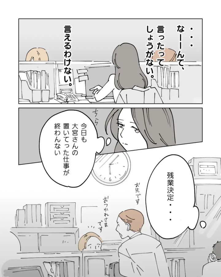 なんてこと言えるはずもなく、私は今日も残業して大宮さんが置いていった仕事をこなします。心の中でため息をつきながら、独身という立場は本当に損な役回りだとひそかに愚痴をこぼしたのでした。