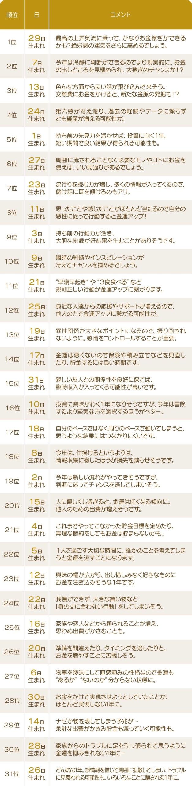 1. 生年月日別に見る、金運ランキングを発表!