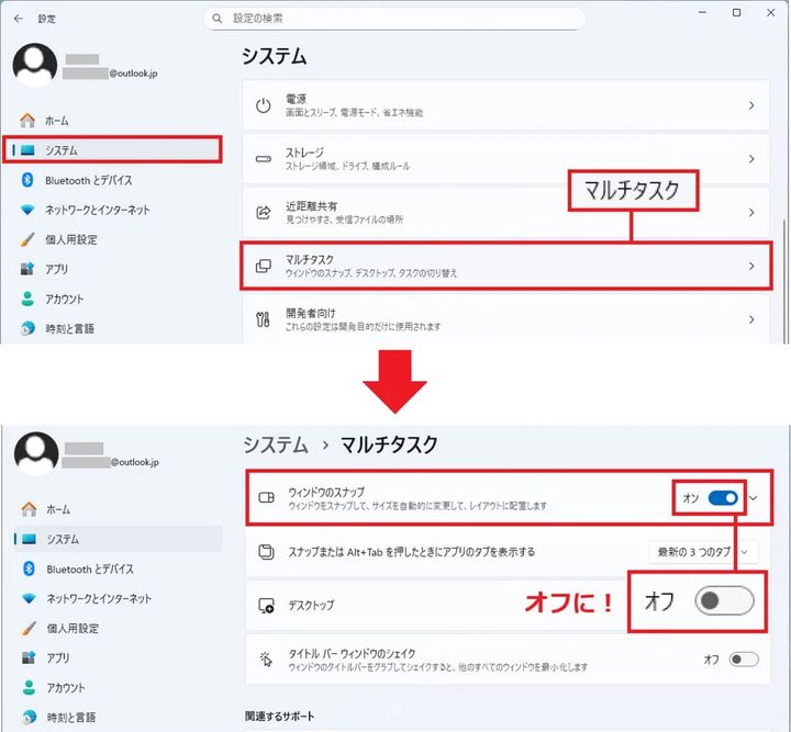 また、ウインドウを動かして勝手に画面が整理されてしまうのは、「ウインドウを画面の上部にドラッグしたときにスナップレイアウトを表示する」という機能が原因ですが、この機能だけオフにして、ほかの機能は残すことも可能となっています。