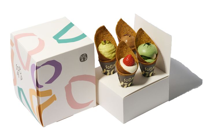 「I’m donut?」の平子良太シェフがプロデュースする、そば粉クレープ専門店。東京駅構内にあり、朝8時から営業。【手前から時計回りに】いちごのショートケーキ¥480ピスタチオクリーム¥360チョコレートクリーム¥320抹茶生チョコ¥380(SOBAP グランスタ東京店)