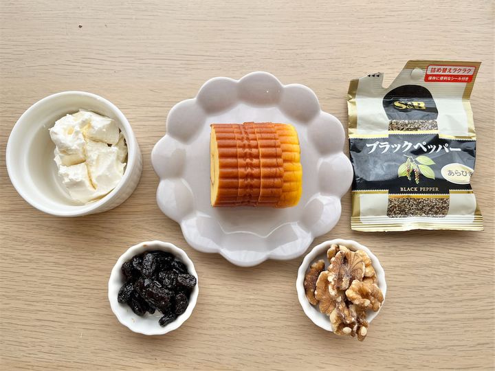 2. 容器に、クリームチーズ、レーズン、くるみ、ブラックペッパーを入れて混ぜる。