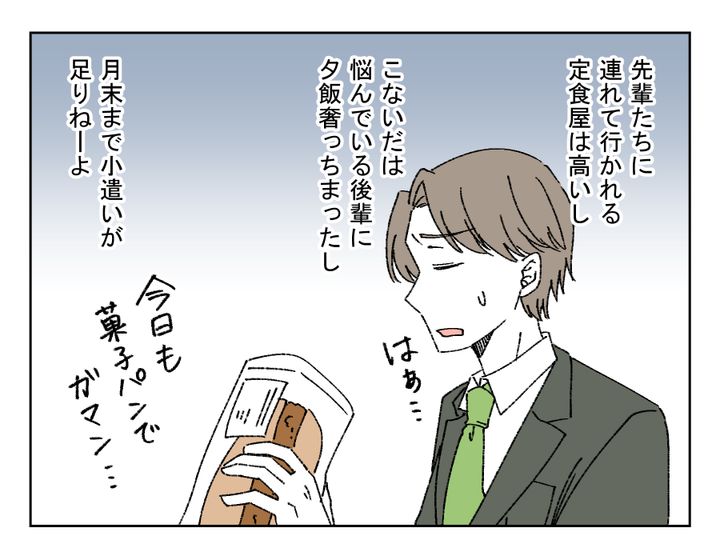 ユウノスケさんの職場は、先輩からのお昼の誘いが多いわりに、奢るという文化はあまりないのだそう。それなのにユウノスケさんは仕事に悩む後輩に「たまにだから」とカッコつけて奢ってしまうらしく、結局自分で自分の首を絞める結果に。お金の使い方がうまくないうえにビールとタバコはやめられない。そのうえアカネさんにしっかりと財布の紐まで握られていたら……菓子パンという選択肢しかありませんよね。ただ、お小遣いアップより、お金の使い方を相談したほうがいいと思うのは私だけでしょうか?