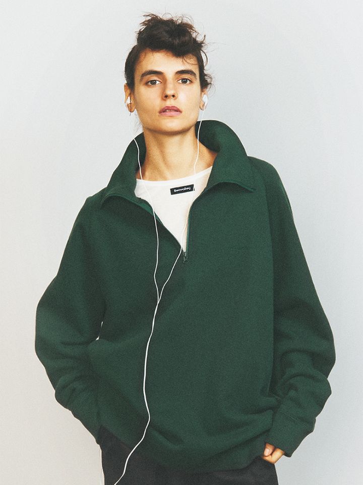 スウェットの高さのあるネックを折ってストリートな雰囲気に。タグをポイントにした白Tで、気の利いたカジュアルが完成。 グリーンスウェット/エイトンステイプルズ 白タグつきロゴT/SEA(エスストア) パンツ/ebure(LITTLE LEAGUE INC.)