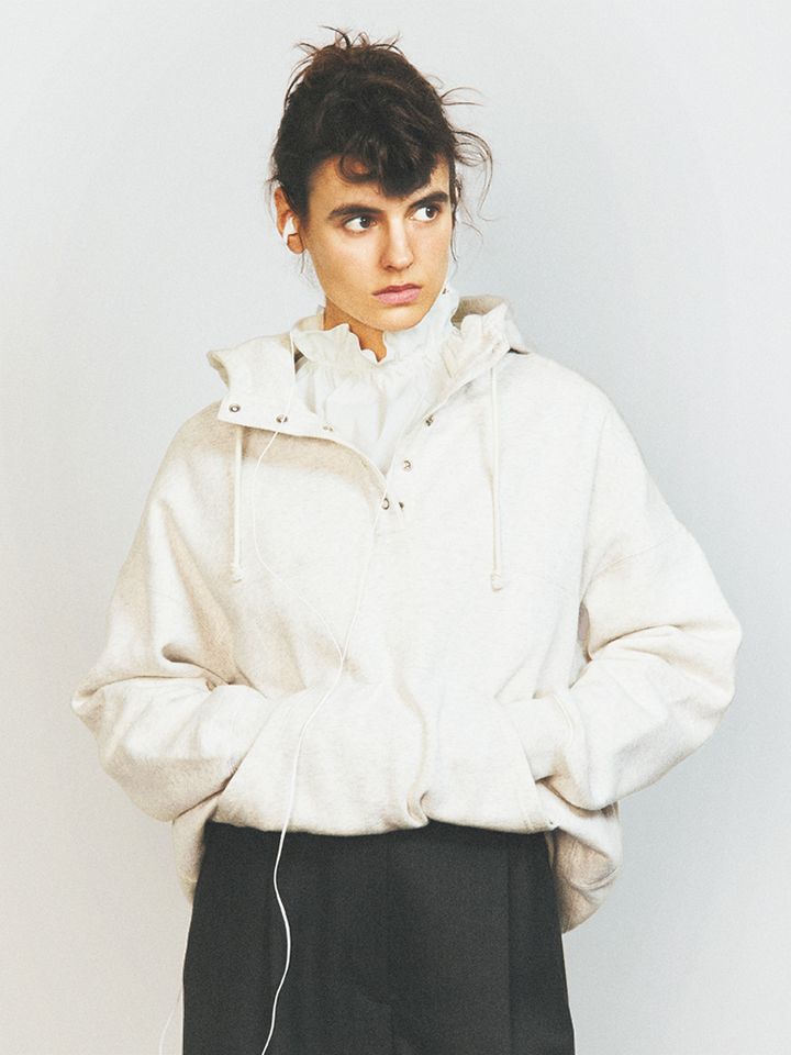 大げさな甘さを受け止める、グレーの王道スウェット。フードも盛り上げに一役。 パンツは着まわし。グレーフードつきスウェット/シップス エニィ(シップス インフォメーションセンター) 白ギャザーシャツ/hLM(ヒューエルミュージアム ギンザシックス)
