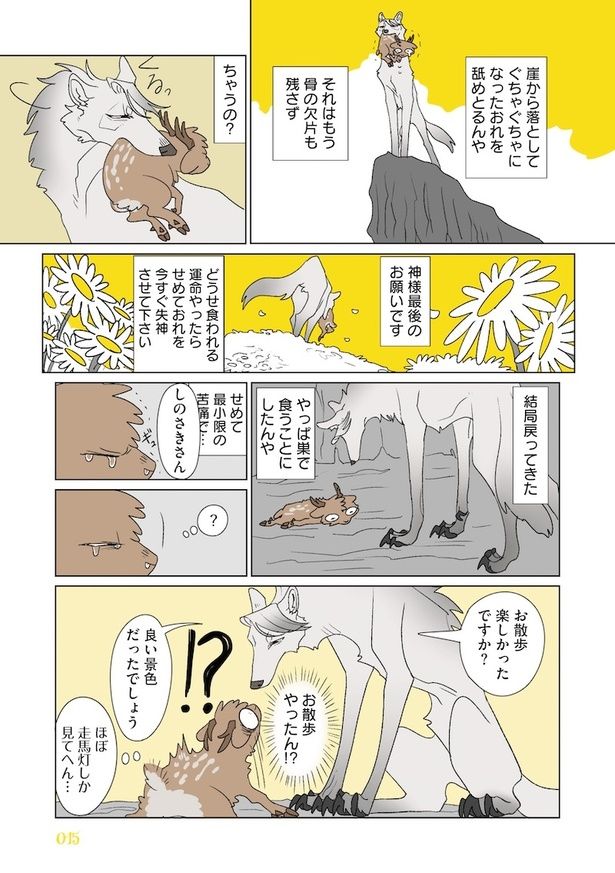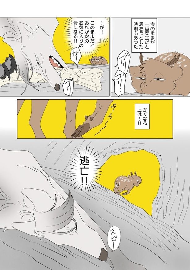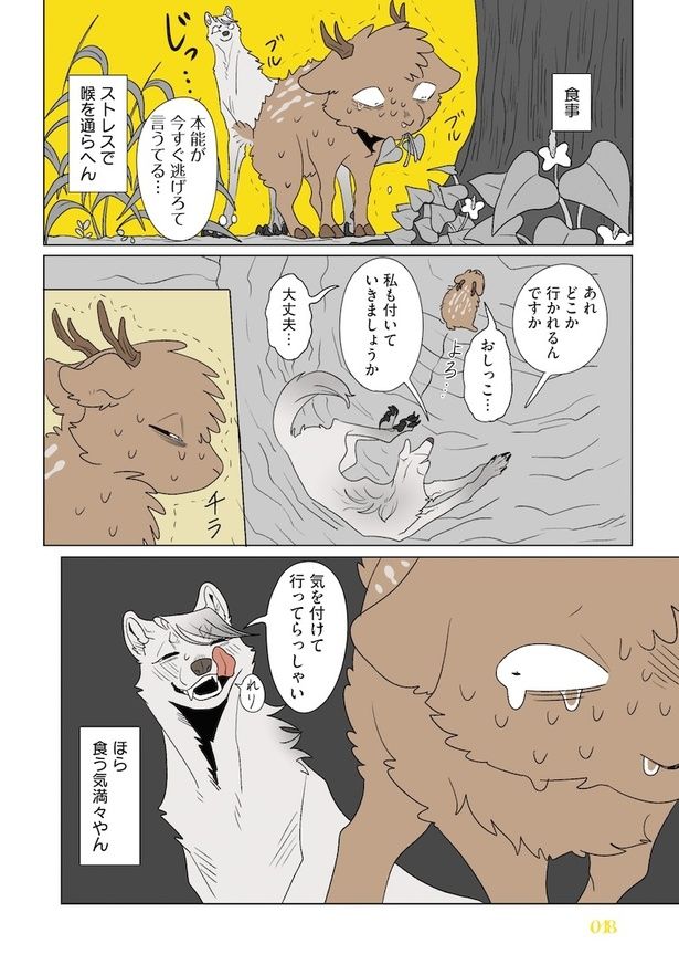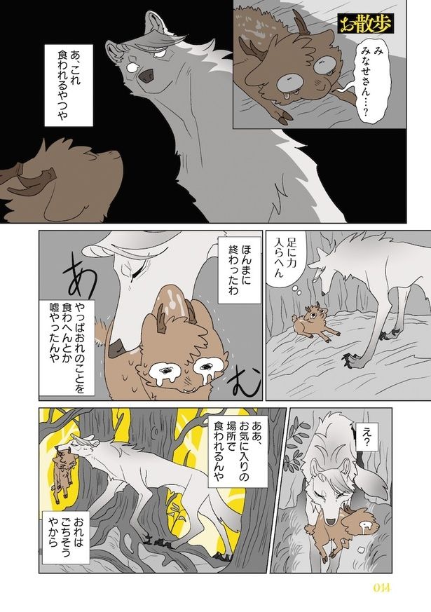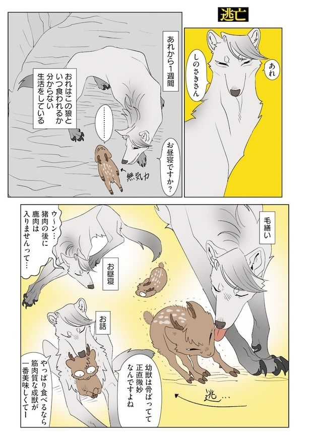 3. 「あ、これ食われるやつや」逃げようにも足に力が入らず、オオカミに背中を咥えられて!?/ふたりのけもの②
