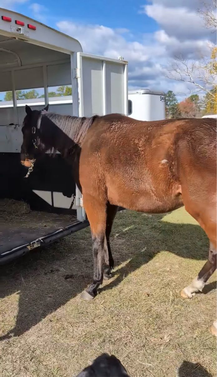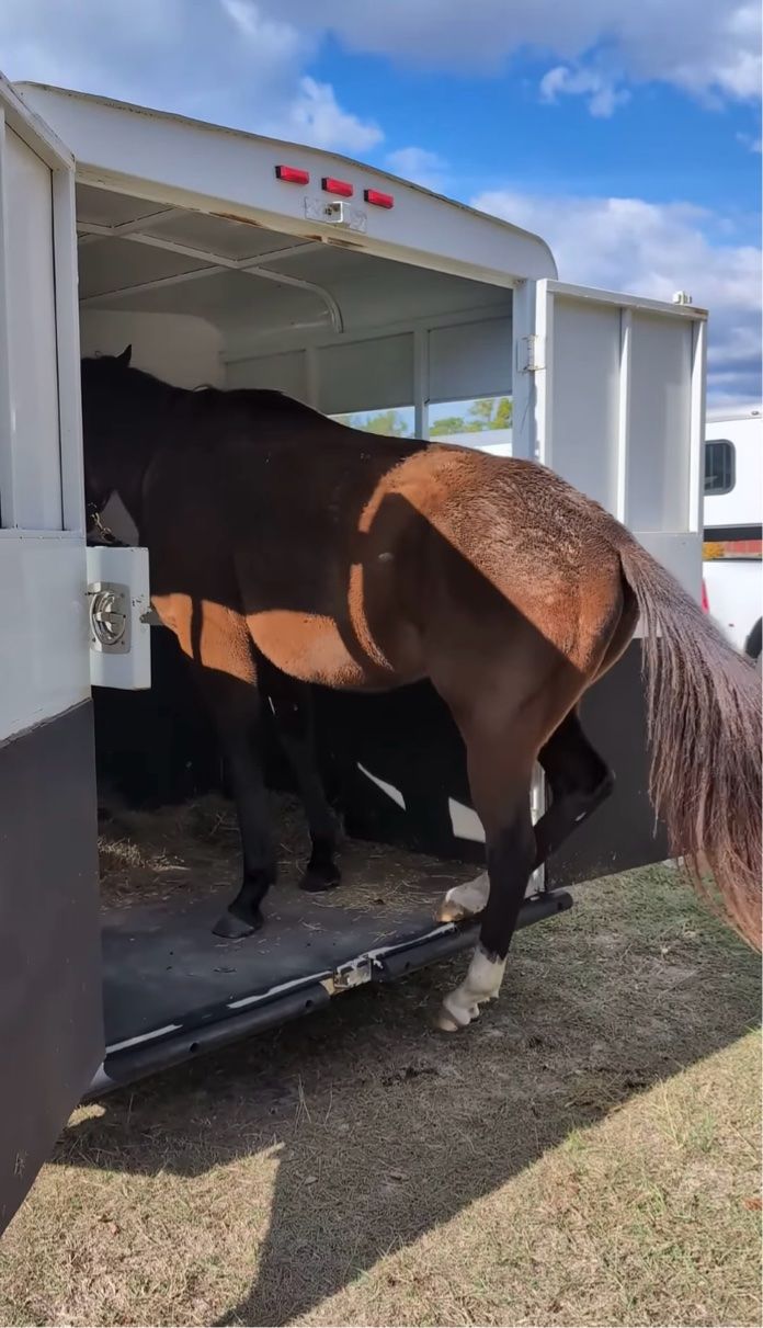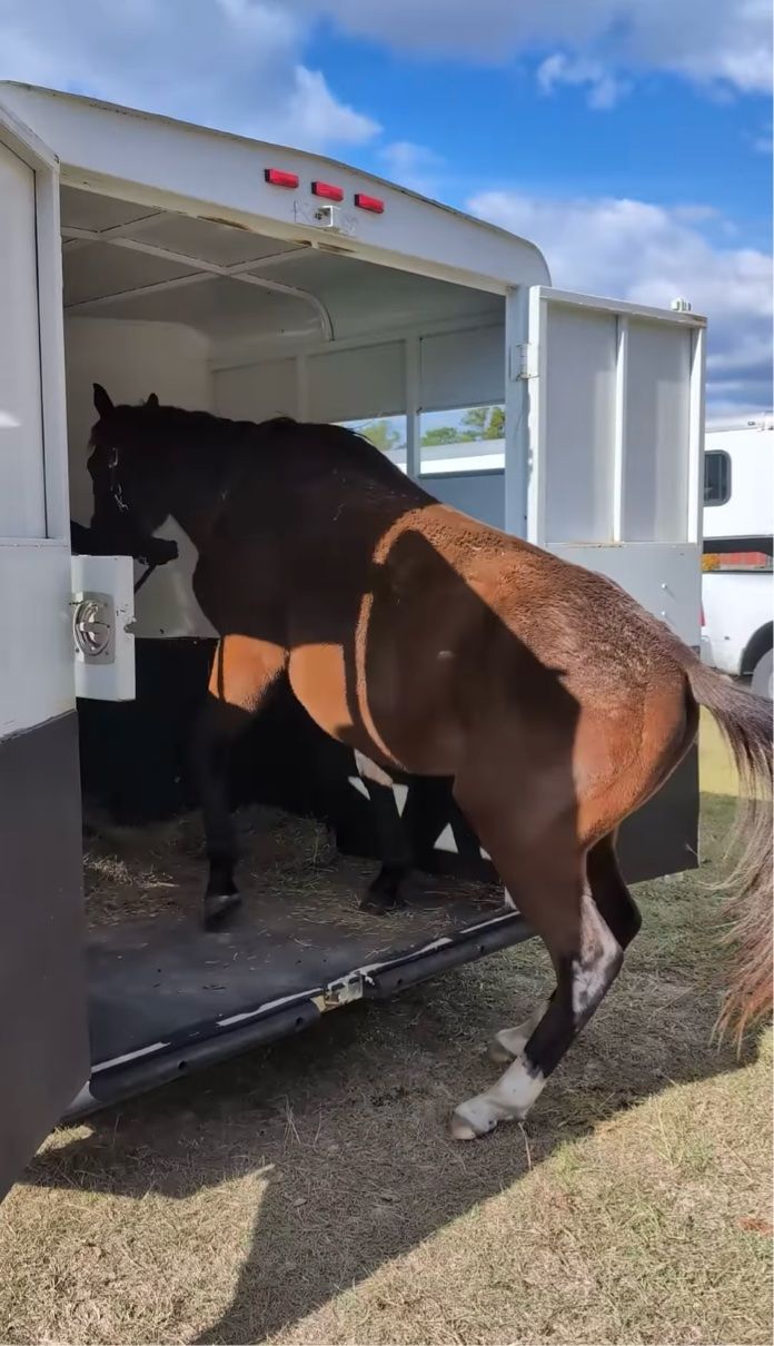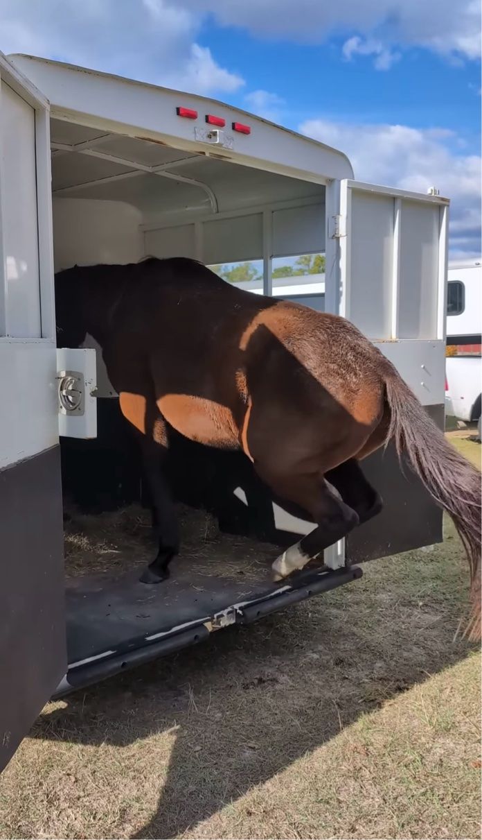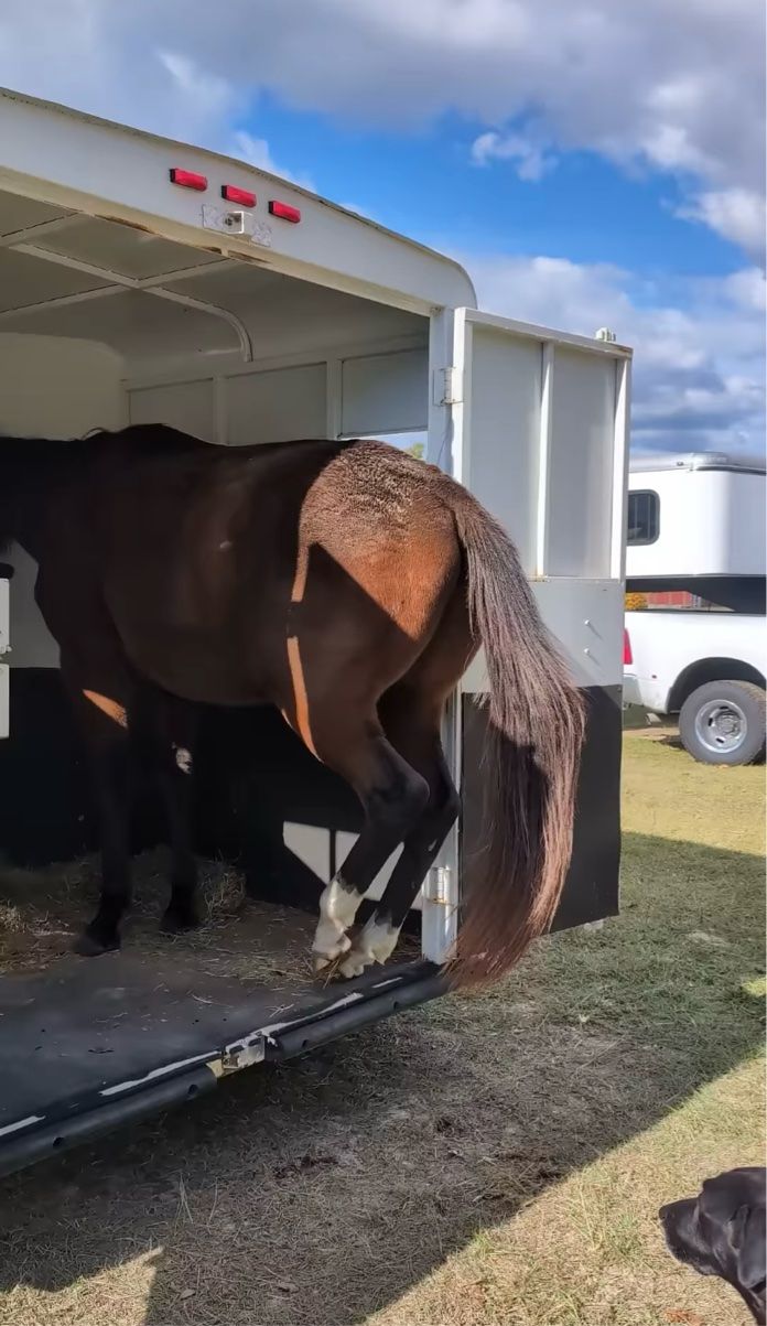 トレーラーに乗っているウマが、後部ドアのふちに立っています。 この子は、トレーラーから後ろ向きに降りる練習をしているところだったのです。