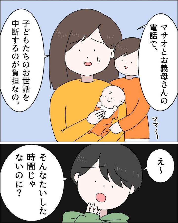「マサオとお義母さんの電話で、子ども達のお世話を中断するのが負担なの」と具体的に説明しましたが、それでも「え~。そんなたいした時間じゃないのに?」と首を傾げるマサオ。
