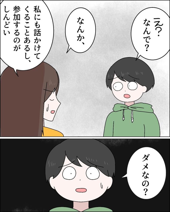「え?なんで?」と驚くマサオに「なんか、私にも話しかけてくることあるし、参加するのがしんどい」と正直に気持ちを伝えると、マサオは「ダメなの?」と困惑の表情を浮かべ、私が何にしんどいと感じているのか全く理解できないといった様子。