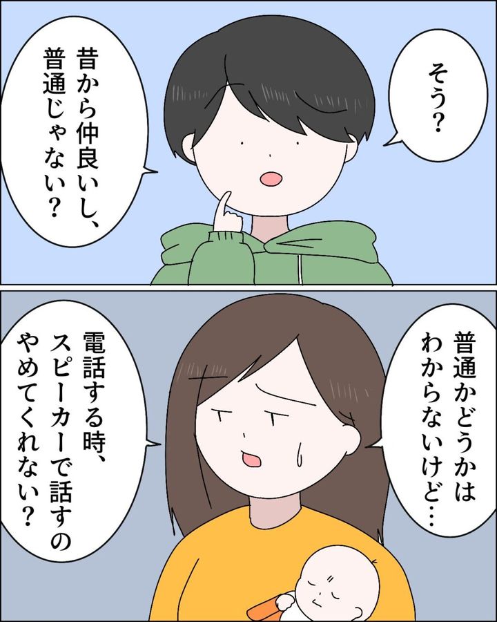 「そう?昔から仲良いし、普通じゃない?」ときょとんとするマサオに「普通かどうかはわからないけど・・電話する時、スピーカーで話すのもやめてくれない?」と思い切って伝えました。
