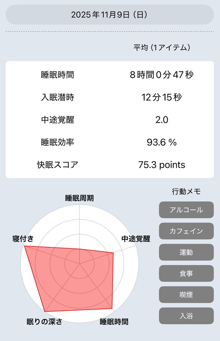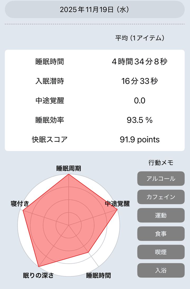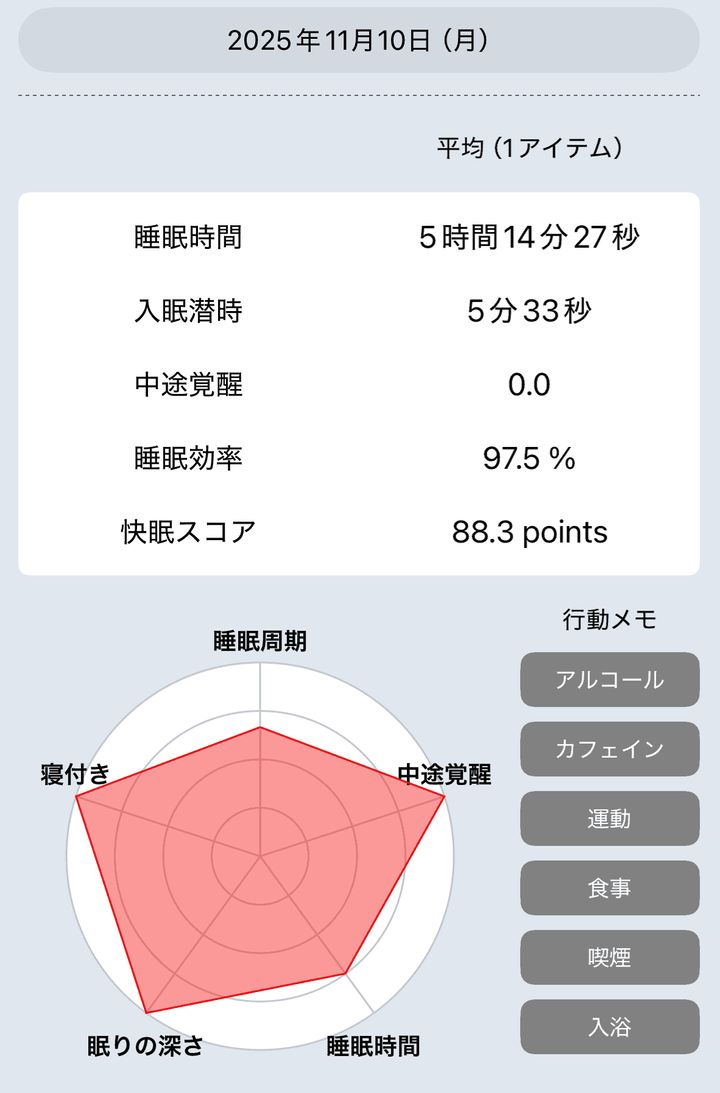 相変わらず寝つきは良く、眠りも深いまま。途中で目が醒めなくなったので快眠スコアが上昇しています。