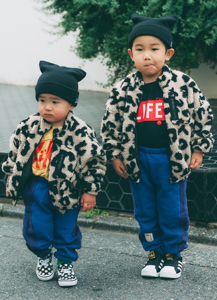 NAME:そうまくん・4歳&てったくん・2歳『ペアマノン』のレオパード柄ボアジャケット×『ボボショーズ』のスウェットパンツ×『ニューエラ』のイヤービーニーで、見事なリンクコーデを見せてくれた、そうまくん&てったくん。トップスやスニーカーでさりげなく変化をつけつつ、元気いっぱいで遊び心満点な仲良しリンクコーデ。item▼