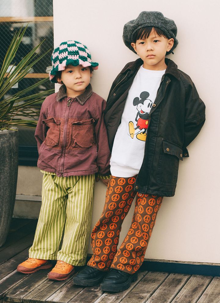 ピースマークのプリントパンツにミッキーマウスのトップスを合わせたあたるくんと、ストライプ柄のパンツにニットのチューリップハットを合わせたかなうくん。『ザラ』のアウターをイロチでお揃いにしつつ、パンツの柄や個性たっぷりなハットをポイントに、レトロヒッピーなムードをまとったおしゃれ兄弟コーデ。item▼
