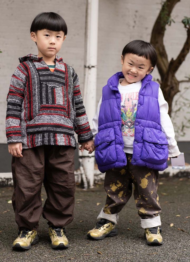 NAME:ときくん・5歳&さくくん・4歳ブラウンのパンツとゴールドの『アシックス』スニーカーをリンクさせたスポーツMIXコーデ。編み目の表情が可愛いメキシカンパーカーをオンしたときくん、ボリュームのあるダウンベストを羽織ってやんちゃに仕上げたさくくん。手を繋いで歩く姿が微笑ましい、仲良しきょうだいの冬スタイル。item▼