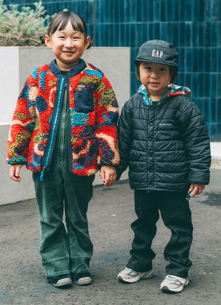 NAME:アンちゃん・5歳&ゼンくん・3歳カラフルな色遣いが魅力の『パタゴニア』のボアブルゾンに、深みのあるモスグリーンのオールインワンを合わせたアンちゃん。ゼンくんは、黒のアウター×パンツ×キャップでシックにまとめたクールな佇まい。インナーに『パタゴニア』のカラフルなパーカーを取り入れて、さりげなく柄をリンクさせたニュアンスコーデがおしゃれ♪item▼