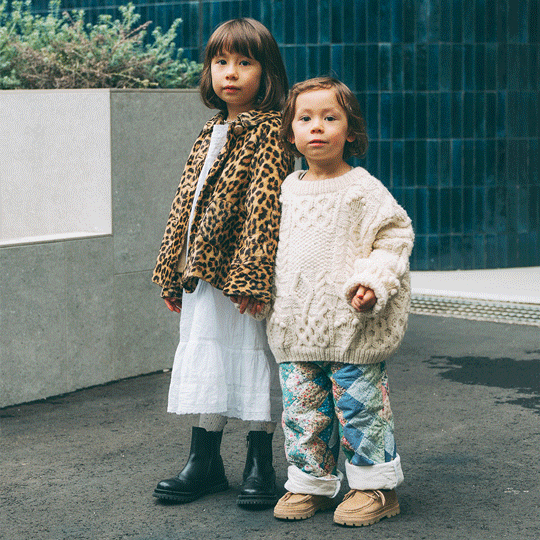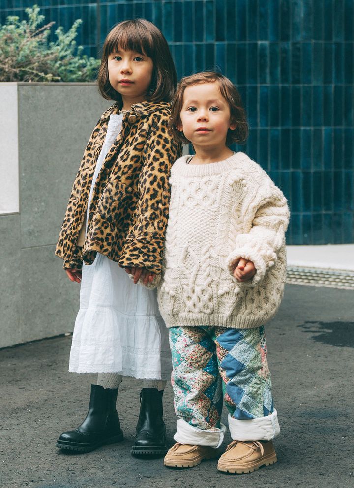 NAME:neneちゃん・5歳&niniくん・3歳お姉ちゃんのneneちゃんは、白ワンピにレオパード柄のファーアウターを羽織って甘辛スタイル。弟のniniくんは、ローゲージのざっくりニットにパッチワークボトムを合わせた、ほっこり愛らしいコーデ。質感の異なるホワイトアイテムを取り入れた、冬にぴったりなやわらかリンクコーデ。item▼
