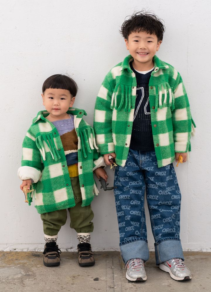 NAME:ジョージくん・5歳&ダンくん・2歳ほっこり感満点の厚手素材×フリンジが可愛い『メイドフォーミニ』のアウターをオソロで楽しむジョージくん&ダンくん。お兄ちゃんは、プリントデニムで遊び心を、ダンくんはミリタリー調のパンツでこなれ感をプラス。元気に駆け回るたびにフリンジが揺れて、元気いっぱいのふたりにぴったりなウィンターコーデ。item▼