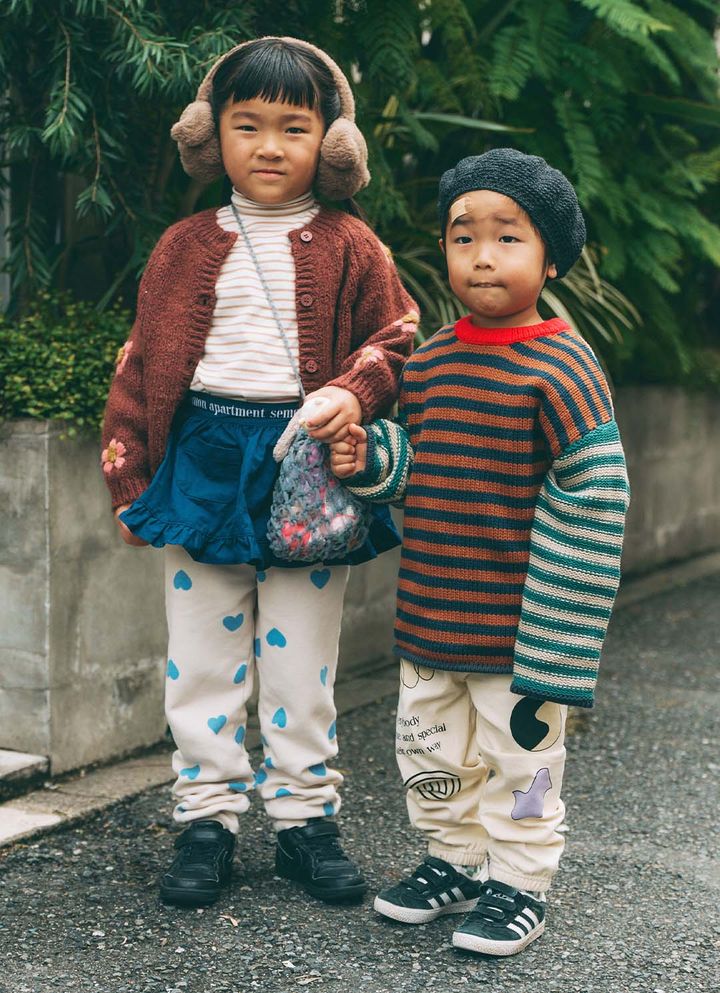 NAME:さいりちゃん・5歳&えんくん・3歳ストライプのトップスをさりげなくリンクさせた冬コーデ。さいりちゃんは、ハートのラクチンパンツにフリルスカートを重ねて、今っぽいレイヤードスタイル。えんくんは、グラフィカルなパンツでストリートに。雰囲気の違うふたりの装いも柄や色味をポイントでリンクさせることでまとまった印象に。item▼