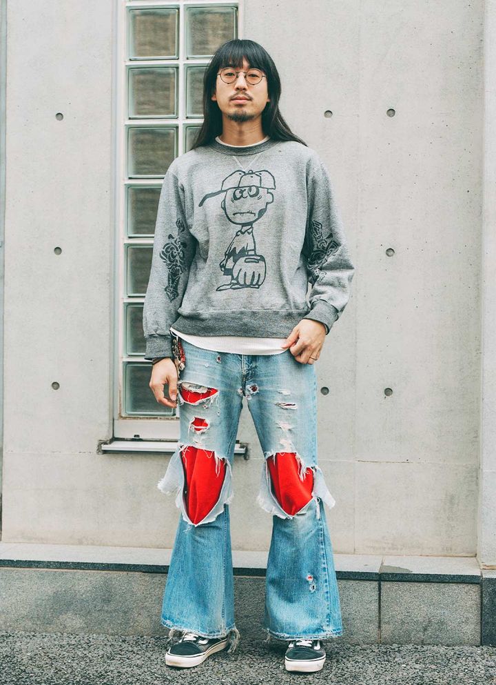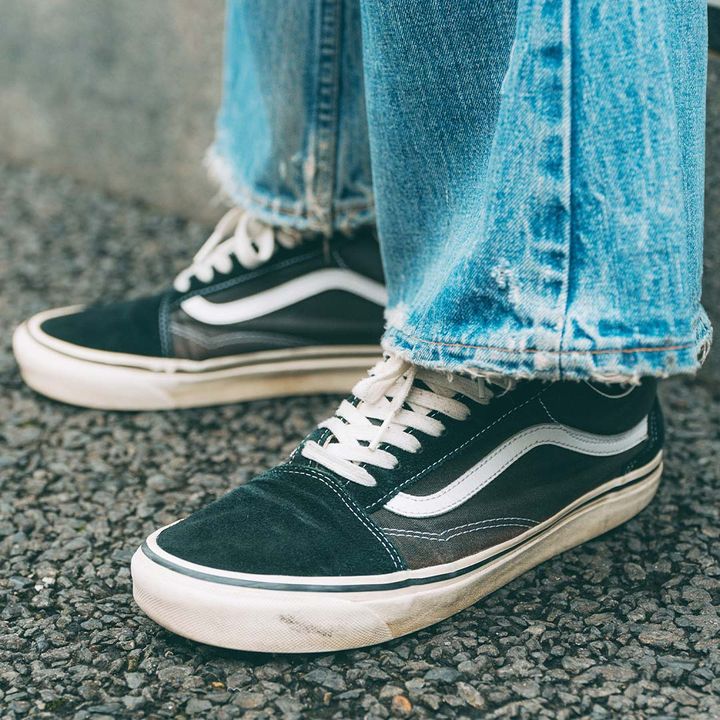 『ヴァンズ』のブラックスニーカーが、ダメージデニムとの相性抜群!ストリート感漂うパパの足元スタイル。