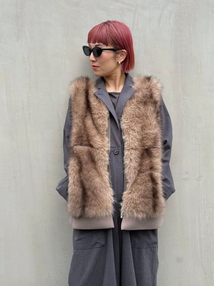 「ジャンプスーツは、1枚だとちょっぴり物足りなさを感じるので、ファーベストでアレンジ♪ 冬気分をしっかり味わえるし、コーデも即、洒落ます! サングラスをONして、クールに仕上げてみました」(ヘアサロンPARKオーナー 水戸怜子さん)