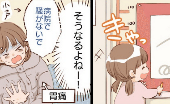 双子を連れて病院に行くことはすごくハードル高いのですが、この日、私は胃痛に襲われ、双子を預けることもできずに病院へ。待ち時間は30分くらいだったのですが、双子は動きたい盛りで、待合室のいろいろな椅子に座ったり動き回ったりしていました。周りには高齢者が多く、静かにしようねと伝えても双子には伝わらず……。