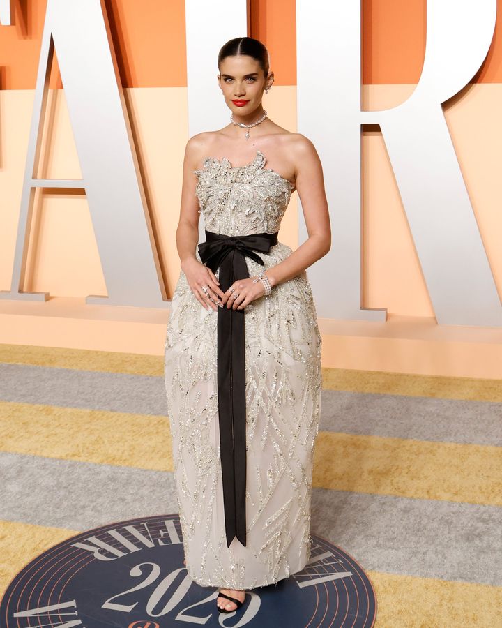 立体的で精巧なシルバーのビーズ刺しゅうが、クチュリエならではの高度なクラフトマンシップを感じさせるズハイル・ムラドのドレス。ウエストの黒リボンがアクセントとなり、リュクスな中にもモダンさを感じさせる一着です。 2025年のオスカー・パーティより。