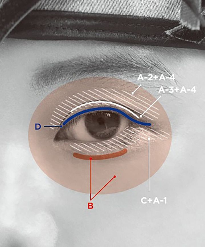 涙袋は、ペンシルコンシーラー(C)で下まぶたのくすみを払い、ベージュシャドウ(A-1)を重ねてぷっくり感を強調。シェーディング(B)で下のラインを引き締め、陰影をより際立たせる場合は、アイホール全体に薄く忍ばせてもOK。上まぶたは、アイシャドウのピンクベージュ(A-2)とピンク(A-4)をミックスしてアイホール全体に。ブラウン(A-3)とピンク(A-4)のミックスは目の際にライン状に。まつ毛の根元は、黒アイライナー(D)で埋め込みラインを。下まつ毛目尻には4〜5本描きまつ毛をプラス。