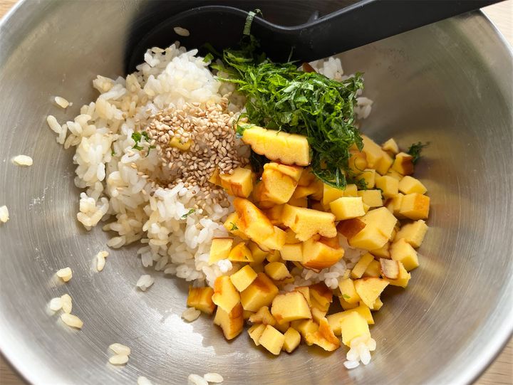 3. 2に伊達巻、青じそ、白いりゴマを混ぜ、2等分にして三角形に握る。