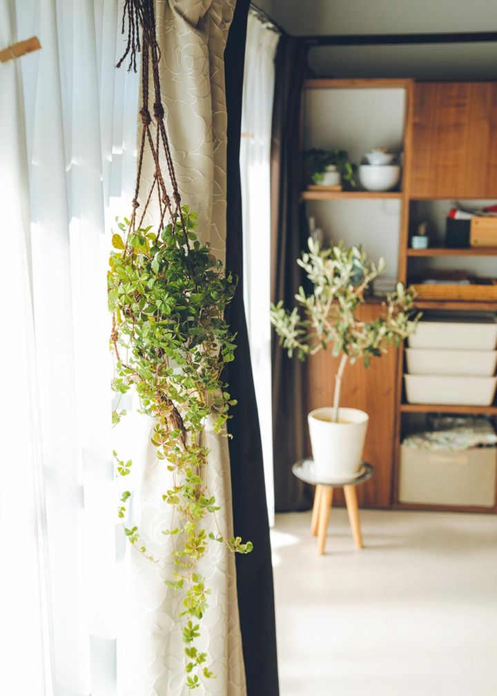 オリーブやハンギングにしたシュガーバインが部屋に彩りをプラス。植物が好きだが軽い喘息があり、せきが誘発されないよう数を厳選している。