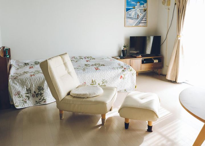 現在の住まいは約35平方メートルの1DK。居室部分は11畳あるので、半分はベッドコーナーにしている。休憩用のパーソナルソファ、その日の気分で置き場所を変えて愛用中。
