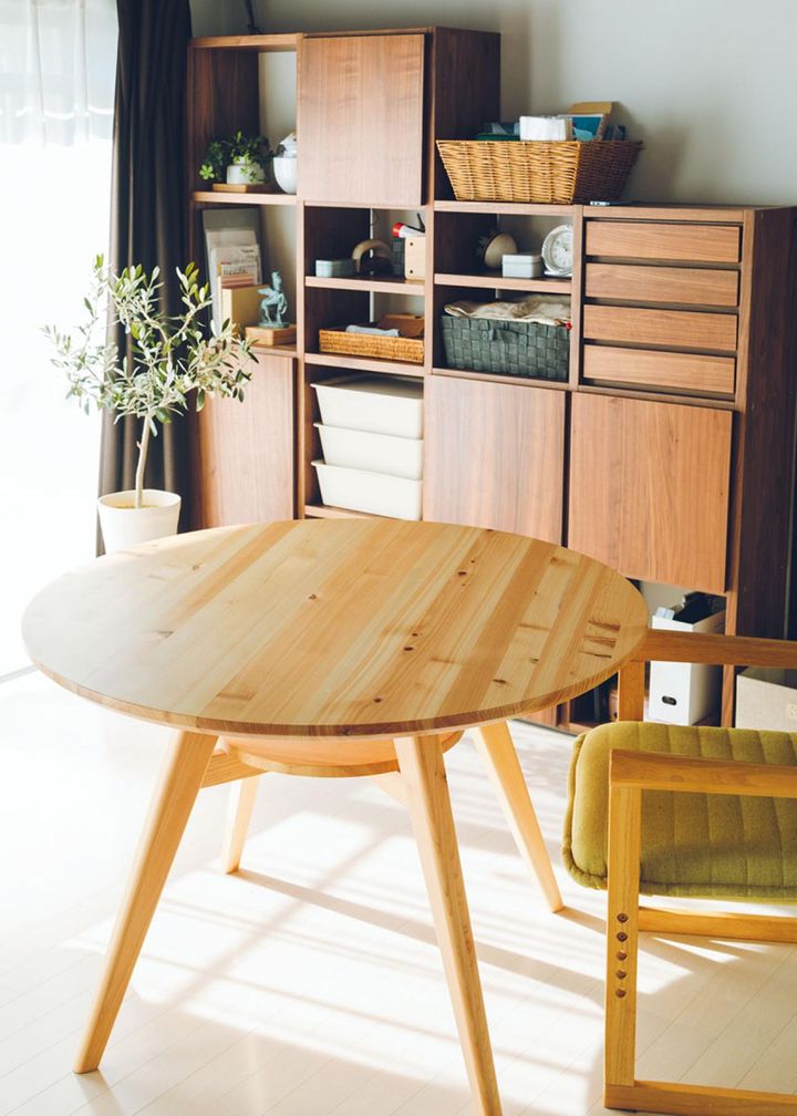 丸テーブルは「島忠」、収納棚は「ニトリ」で買い替えたお気に入り。前の住まいで安易に選んだテーブルは仕事中に体が痛くなり、100円ショップのケースを並べていたスチールラックはどこに何があるかわからないのが不満で処分。