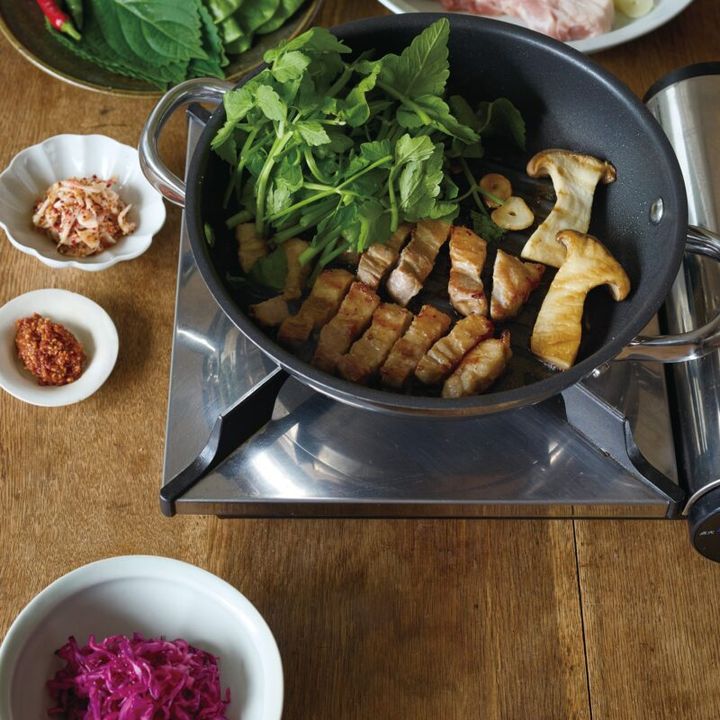 「わが家で焼き肉といえば、サムギョプサルが定番です。きのこや根菜を豚肉の脂にからめて焼いたり、チーズやナムルと包んで食べたりと、何㎏もの豚肉を1回の食事で食べきっていました。家族がそれぞれ自由にいろいろな食べ方を楽しめるのもサムギョプサルの魅力で、普段の料理としても、おもてなし料理としても重宝するメニューです。