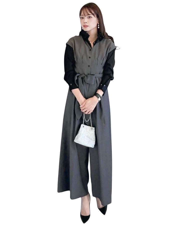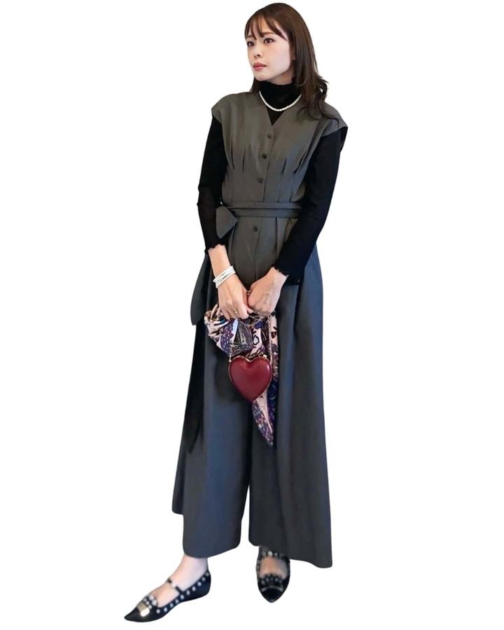 立体裁断×ウエストタックで、着るだけで細見え&脚長 が叶う、40代の味方のオールインワン。小物チェンジでイメージが変わるから、多スクママには嬉しいアイテム。