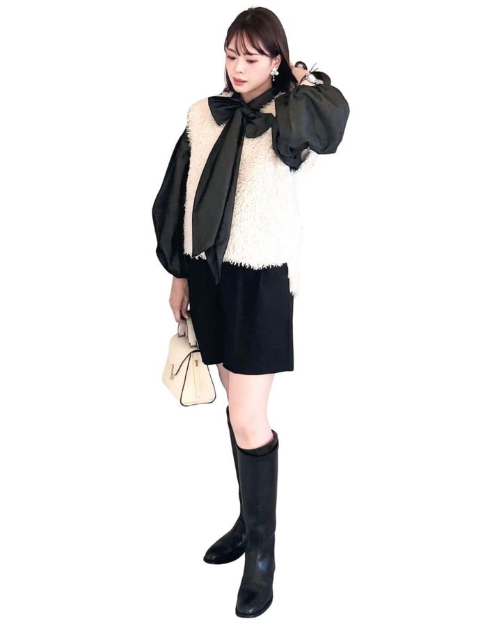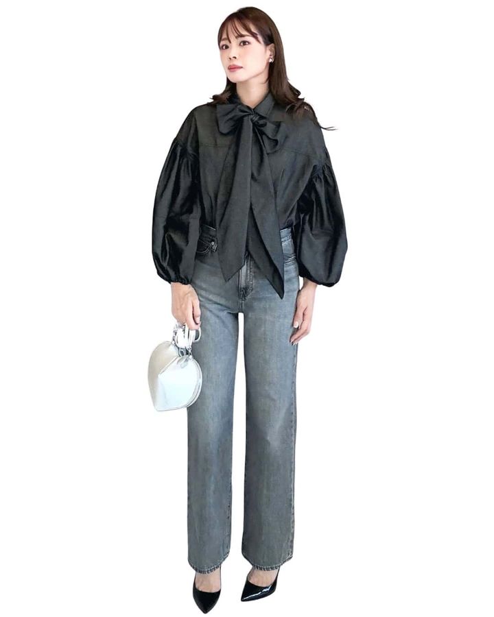 ①無理なく華やぎをプラスしてくれる「リボンブラウス」でショッピングへ