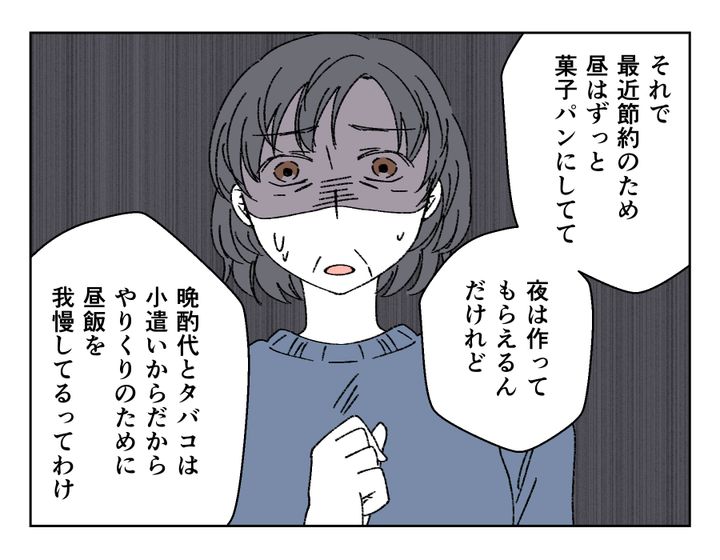 ユウノスケさんのお母さん、親だからこそ気づけたのかもしれませんが、息子が痩せたのを見逃しませんでした。そして昼食事情を聞いて愕然。「やりくり」と言いながらお昼を菓子パンにしていたことを知ります。痩せたのはまだ少しだったものの、明らかに顔色や肌質が以前より悪い息子。そのうえ晩酌をしているようなので、夕飯もそう多くはなさそう……お母さんはいずれ体調を崩すのが目に見えている息子の生活を知り、思わず頭を抱えてしまったようです。