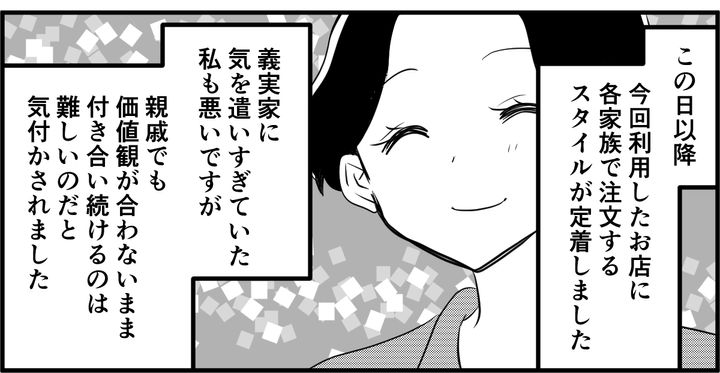 自分でも驚くほどハッキリ言いました。失うものは何もないですし、義妹には真正面から言わなければ伝わらないと思ったのです。そしてその後、それぞれが食べたいものを注文。男性陣はみな、ご機嫌に食べています。
