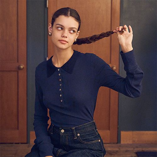 正統派なえりつきでカドを立てることで、ニットの背筋が伸びるという手法。ポロシャツやスキッパー風の規律正しさで印象操作も可能。