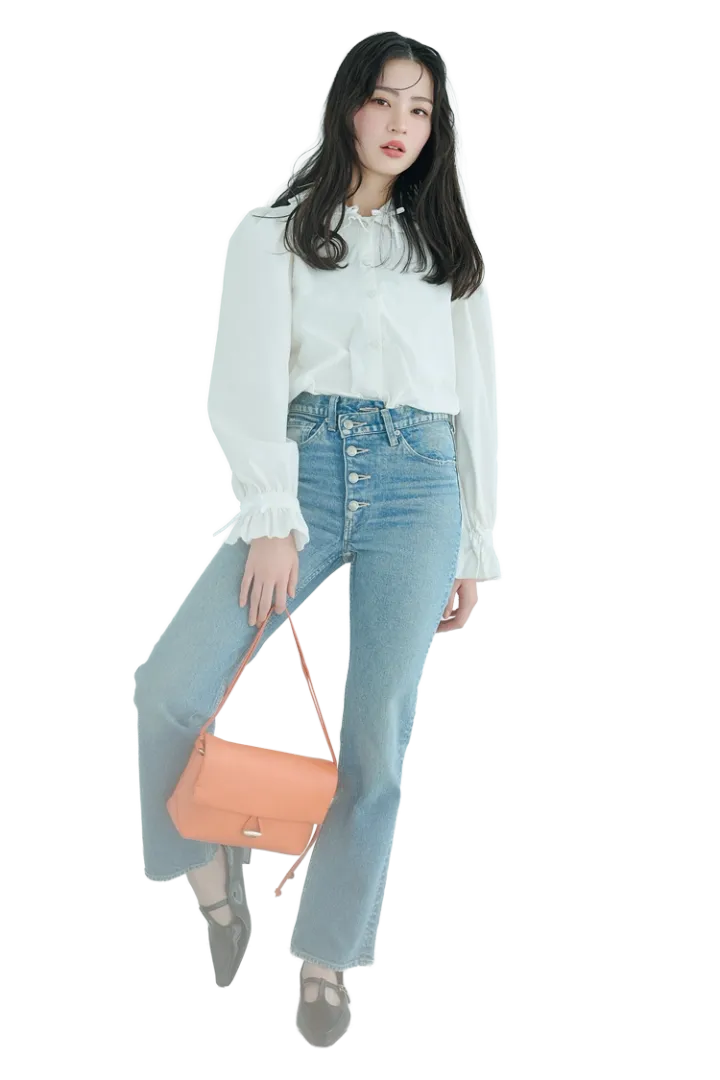 コーデュロイブラウス 9,350円/merry jenny デニムパンツ 23,000円/NORMA JEANS BLU バッグ 8,990円/MANGO パンプス 8,300円/Olu.