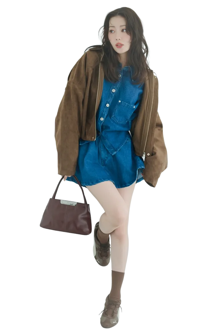 スエードジャケット 10,990円/ZARA(ザラ)デニムシャツとデニムスカートのセット 4,799円/GRL バッグ 15,840円/mucu and ebony(HANA KOREA)スニーカー 13,200円/プーマ ソックス/スタイリスト私物
