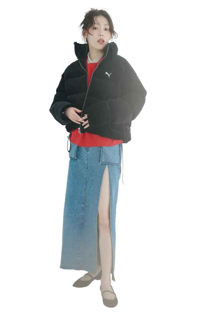コーデュロイジャケット 22,000円/プーマ 赤ニット 2,790円/神戸レタス 白チュールトップス 6,490円/LILLIAN CARAT(リリアン カラット)スリットデニムスカート 17,710円/THREE TO EIGHTY(HANA KOREA)パンプス 18,150円/ダイアナ(ダイアナ 銀座本店)