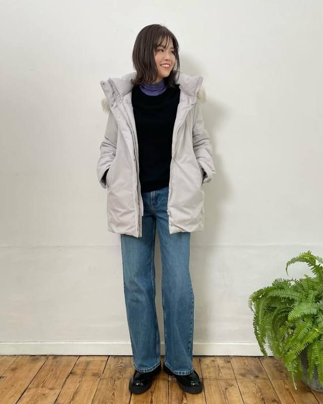 ベージュやモカカラーのダウンコートも40代が選んで間違いない名品。とにかく万能なベージュ系ダウンは、カジュアルコーデもきれいめコーデも難なくこなしてくれますよ。