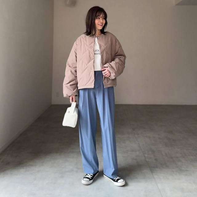 スナップでは、ブルーのパンツを合わせて印象的な配色スタイルに。色物を合わせて華やかスタイルを楽しむ日も、ベージュの優しい色合いがちょうどいいんです。