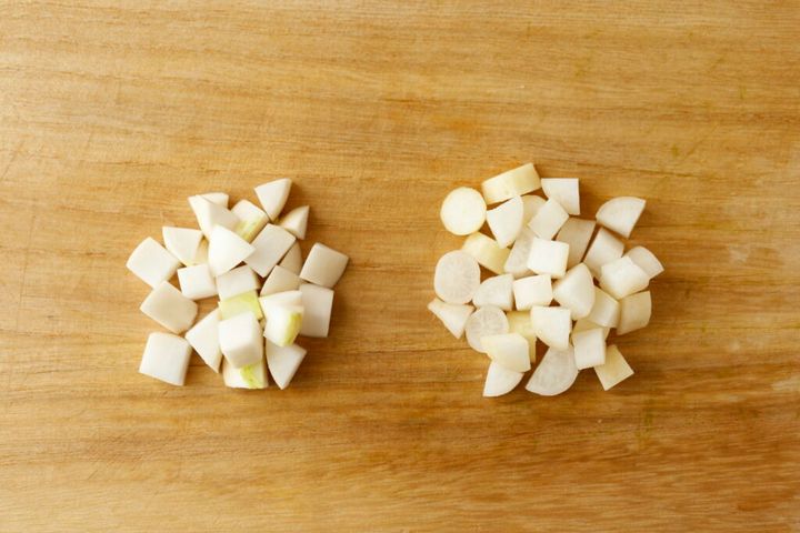 葉を切り落とし、皮をむかずに1㎝角に切る。