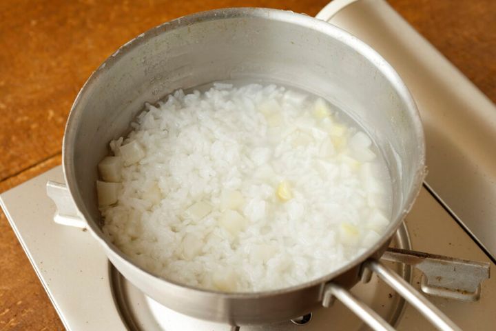 鍋にご飯160g、水2カップを入れてご飯をほぐす。1㎝角に切ったすずな(かぶ)、すずしろ(大根)
