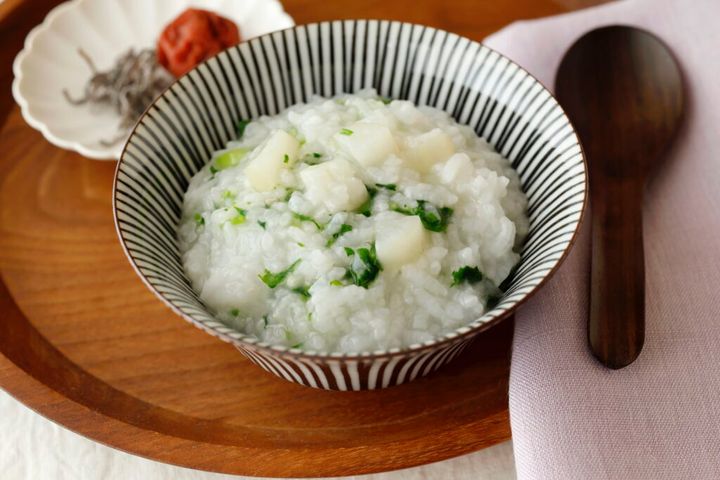 (4)おかゆの鍋に七草、塩を加えて混ぜ、器に盛る。好みで梅干しや塩昆布など添えても。