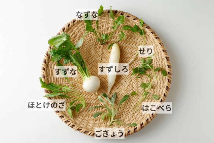 すずな(かぶ)、すずしろ(大根)、なずな、せり、はこべら、ごぎょう、ほとけのざのこと。早春に芽吹くことから、力強い生命力で邪気を払うとされています。