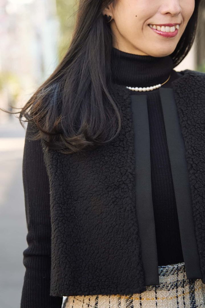 3. トレンドの【ファージレ・ボアベスト】は「ショート丈」ならスカートもワイドパンツも合う!<読者スナップ5選>