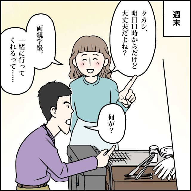 「タカシ、両親学級に一緒に参加してくれない?」タカシにそう言うと、「いいよ」と即答。「ほんと?土曜日空けておいてね」私の言葉に「オッケー」と返事をしてくれました。