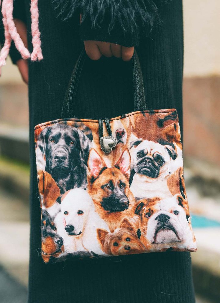 『モイ』のドッグプリントバッグがなんともユニーク! レザー調の持ち手とハートのディテールがこだわりを感じさせる仕上がり。