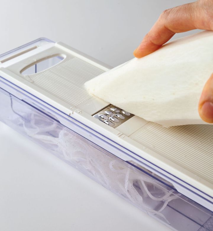 (1)干しえびはボールに入れて水1/2カップを注ぎ、2時間~一晩冷蔵庫に置いて柔らかくもどす。干しえびを取り出して水けをかるく絞り、粗いみじん切りにする。もどし汁はとっておく。大根は皮をむき、スライサーで太めのせん切りにする。